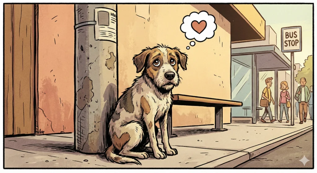 தினமும் அந்த பேரூந்து தரிப்பிடத்திற்கு நூற்றுக்கணக்கான மக்கள் வந்து சென்றவண்ணமே இருக்கின்றனர். ஆனாலும் ஒருவர் கண்ணில் கூட படவில்லை, கண்களில் ஏக்கத்தோடு அங்கு வருபவர்களின் முகத்தில் தன்மீதான கருணை உள்ளம் கொண்டவரை தேடிக்கொண்டிருக்கும் அந்த குட்டி நாயின் உருவம்.