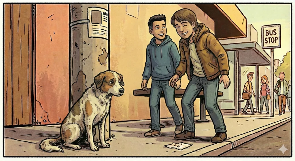 திடீரென்று ஒரு நாள் அதன் வாழ்வில் வசந்தம் வீசியது. யாருக்காகவோ நீண்ட நேரம் காத்திருந்த ஒருவரின் பார்வை அதன் மீது பட்டது. அவருக்கும் ஏனோ அதனை மிகவும் பிடித்து விட்டது. அதன் பரிதாபமான தோற்றமோ, அல்லது அதன் கண்களில் தெரிந்த ஏக்கமோ அவரது பார்வையை அதன் மீதிருந்து அகலாது கட்டிப்போட்டு வைத்தது. அதற்கு ஏதாவது செய்ய வேண்டும் என்ற உந்துதலை அவருக்குள் ஏற்படுத்தியது. தன்னிடம் இருந்த உணவுப்பொட்டலத்தைப் பிரித்து சிறிது உணவை எடுத்து அதற்கு போட்டு விட்டார். அது மிகவும் நன்றியோடு வாலாட்டியது.